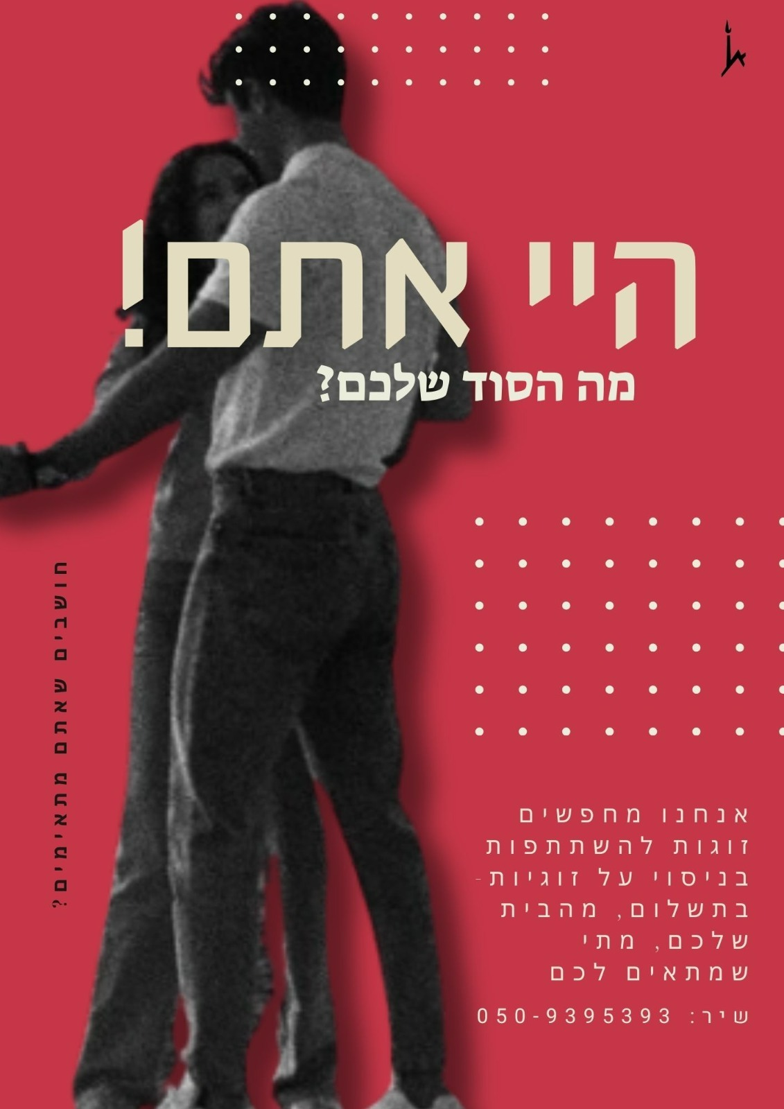 מוזמנים להשתתף יחד עם בן / בת הזוג שלכם בניסוי מחבר מהבית מתי שנוח לכם, בתמורה ל-160 ש''ח אליכם לארנק. במהלך הניסוי תצפו בסצנות מסרטים, תדברו על כך עם בן/ בת הזוג, ותבצעו מטלת זיכרון (הניסוי אורך שעתיים).